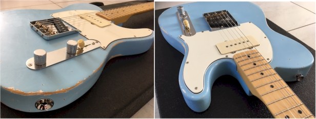 BODY: Originally, her basswood body was a horrible ‘earwax’ amber. Some of this was chipped off, so I removed the whole lot – and refinished her as a daphne blue relic.