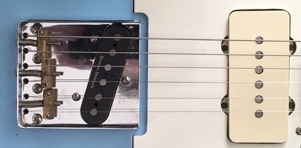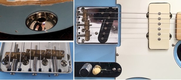 Brass saddles, aged white plastics, aged white selector tip and a superior jack socket … the much-improved screw-in type rather than the original Tele design with the stupid ‘claw’ that keeps working loose and giving players endless grief.