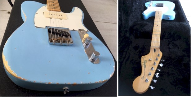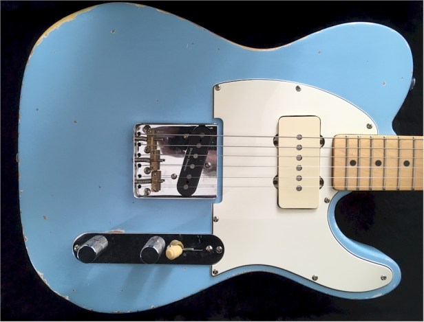 She’s one of the limited edition Telecaster/Jazzmaster ‘Hot Rod’ hybrids produced by Fender/Squier. I’ve refinished her as a light relic in daphne blue with some retro vibes, a 4-way switch mod and a more robust screw-in jack cup.