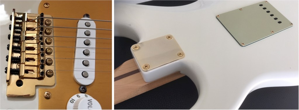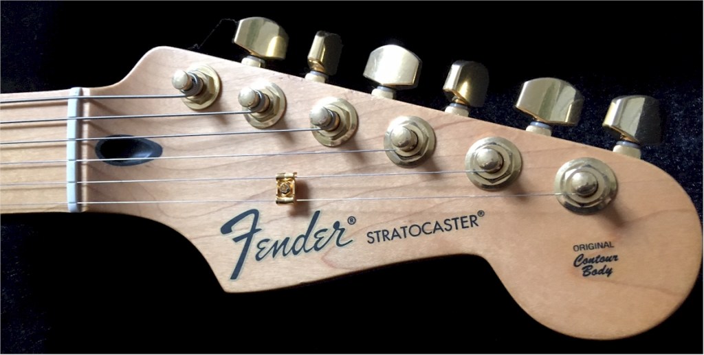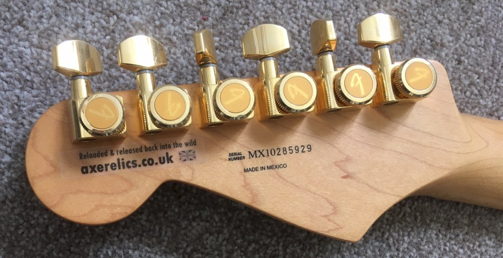 She’s fitted with an amazing set of Fender ‘F’ locking, staggered tuners with 3x tall posts and 3x shorter ones. A set of these RRP at over £100 alone.