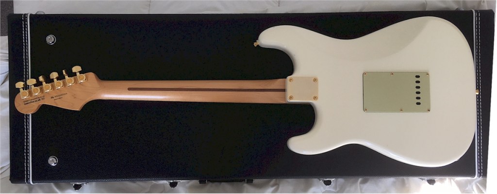 She also comes with a (used) retro-style Fender strap. PS: If you wish, I’ll peel off my sticker on the back of the headstock (for my guitar restore hobby website Axe Relics) before shipping her.