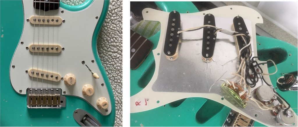 PICKUPS: Previously, she had Fender Mex ones in place. I’ve installed cloth-wired Alnico pups – in fact it’s cloth wiring throughout for a vintage vibe. The pups churn out 5.4-5.7k and are at the warmer end of the scale.