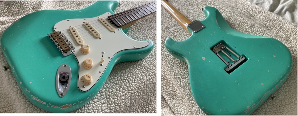 But she must be ash, given the grain – and the weight! She is much heavier that a regular alder or basswood body. So while a typical Strat weighs around 8lb fully loaded, she’s more like 9lb.